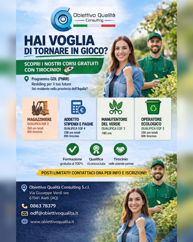 Obiettivo Qualità Consulting organizza percorsi di formazione professionale finanziata dal Programma GOL (PNRR), rivolti ai residenti nella provincia dell’Aquila che desiderano acquisire nuove competenze e una qualifica riconosciuta.