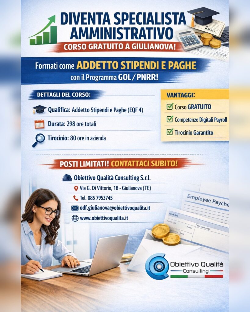 A Giulianova (TE) è attivo il corso gratuito per Addetto Stipendi e Paghe (EQF 4), finanziato dal Programma GOL/PNRR, pensato per formare figure professionali richieste dalle aziende.